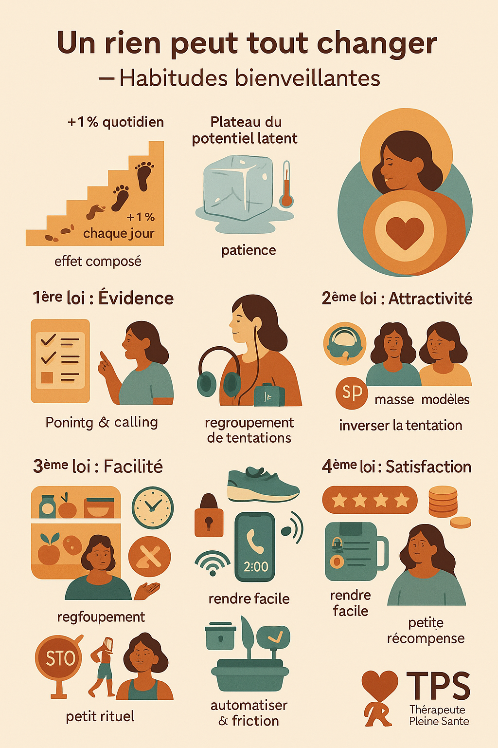 Article pensé pour celles et ceux qui luttent avec la prise de poids ou des conduites alimentaires compulsives (TCA). Douceur, pragmatisme, zéro culpabilité. (inspiré du livre : un rien peu tout changer)