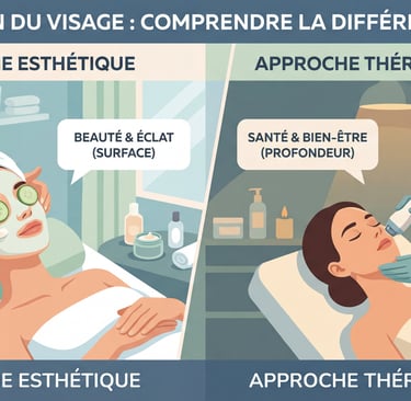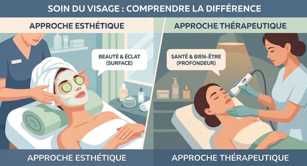Tandis que l'esthéticienne se concentre sur vos attentes esthétiques, le thérapeute esthétique creuse plus profondément : habitudes de vie, état émotionnel, historique des troubles cutanés, facteurs déclenchants.